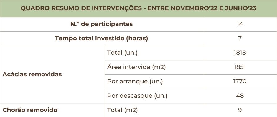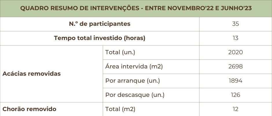 A actividade de dia 10 de Junho, integrada no programa de actividades da FEI~TUR, contou com um participação mais robusta de voluntários e foi possível controlar uma mancha significativa de acácias de grande porte, algo que há algum tempo não se conseguia.