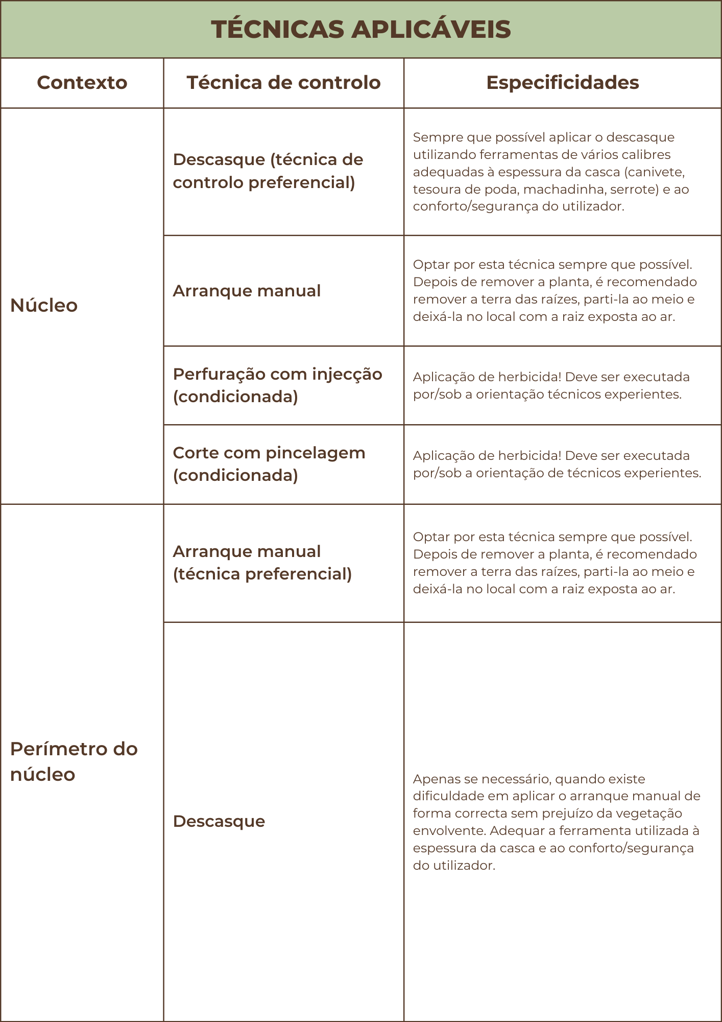 Ao fazermos a remoção preventiva, é preciso ter atenção ao impacto da intervenção. É importante que a equipa não só conheça muito bem a espécie alvo de remoção, saiba identificá-la à distância e nas suas várias fases de evolução, mas também saiba quais as técnicas de controlo mais adequadas a aplicar em cada situação. Além disso, é importante que a equipa de intervenção saiba distinguir a vegetação autóctone e, principalmente, identificar a flora ameaçada ou mais sensível ao pisoteio que possa existir.