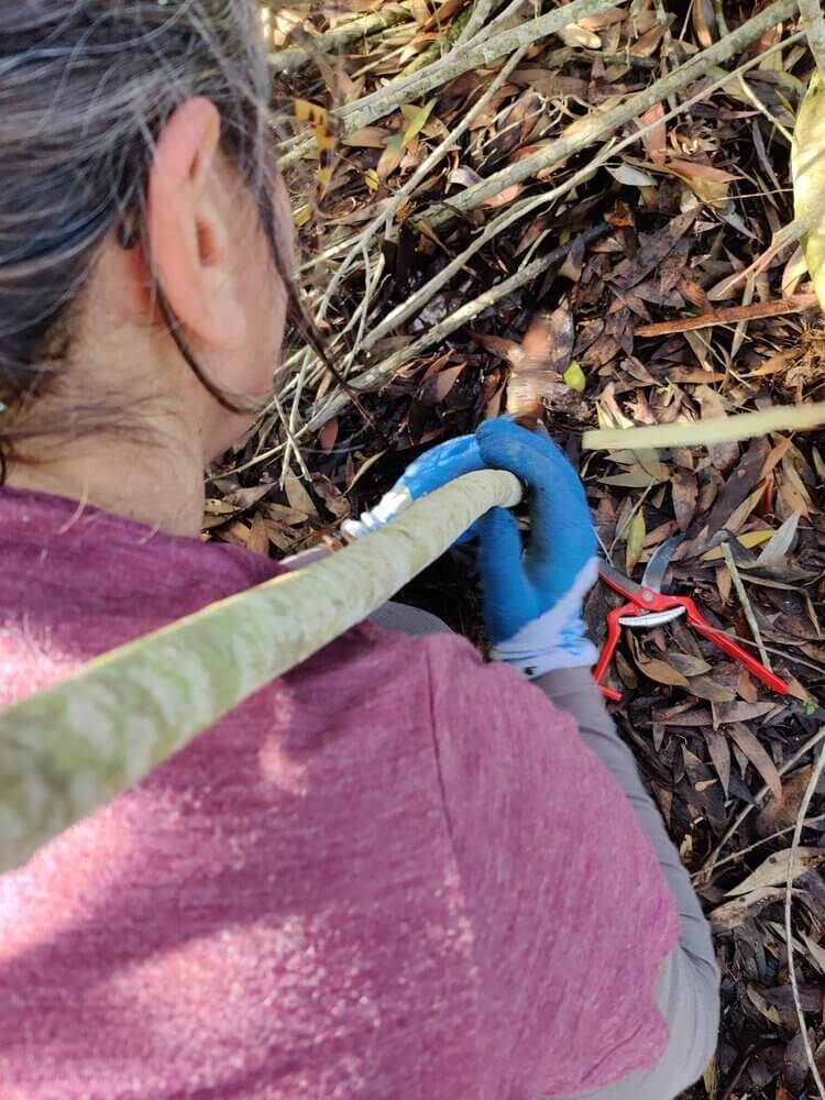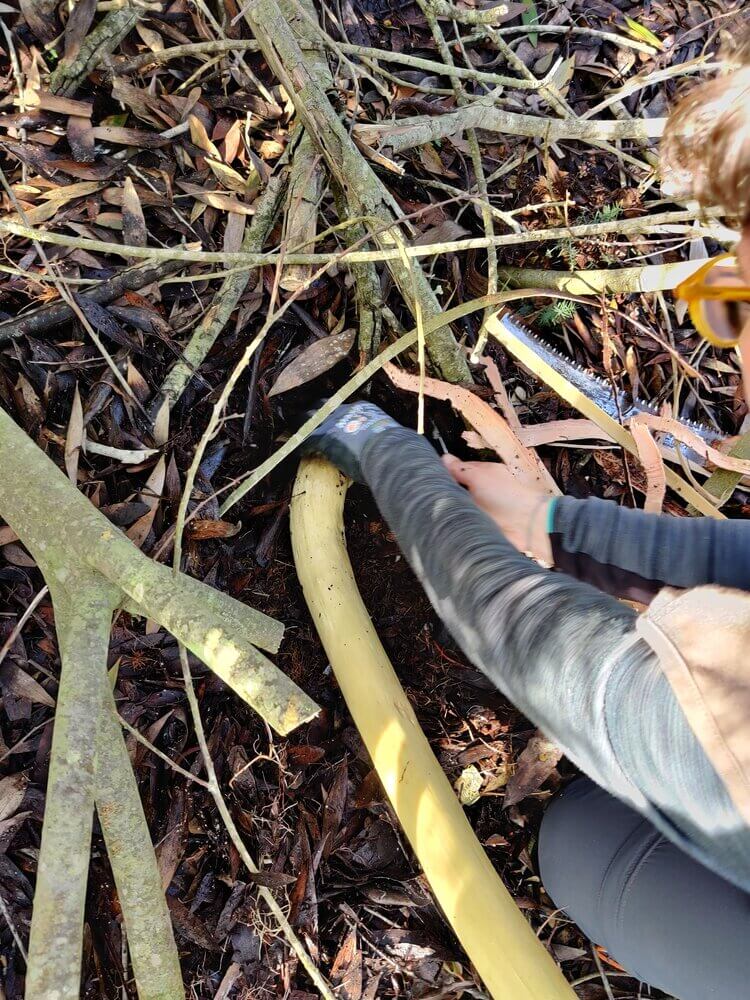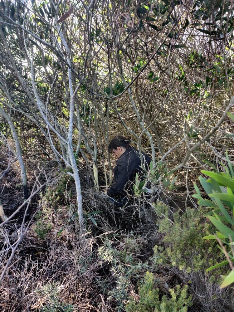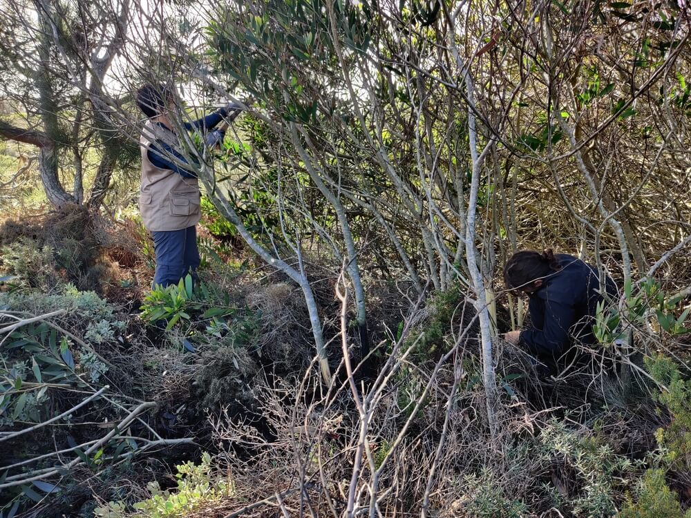 Para a acção de conservação, desta vez, concentrámos as nossas atenções num dos muitos núcleos de acácia-de-espigas (Acacia longifolia) que se encontram em expansão no meio dos zimbrais. Este tipo de intervenção, que implica a deslocação através dos matagais de zimbro-galego até chegar ao núcleo destas espécies invasoras, tem de ser feita com especial cuidado e a atenção redobrada de um grupo pequeno de pessoas para que se reduza ao máximo o pisoteio desgovernado da vegetação autóctone.