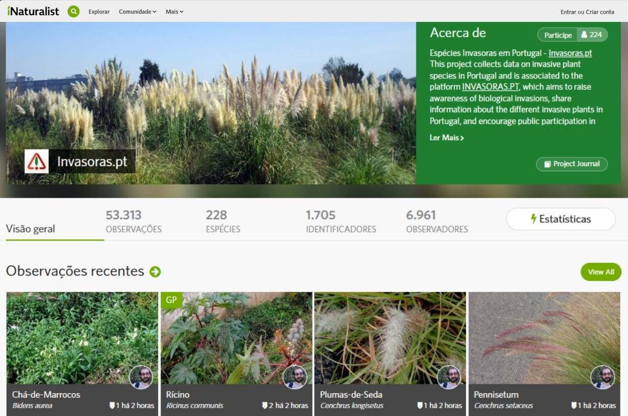 In the INVASORAS.PT project, which may not be new to those following us, besides participating in the events of the Week on Invasive Species, since 2019, we have recorded sightings of invasive plant species on the iNaturalist project of Invasoras.pt. In this project, anyone identifying a potential invasive plant can compare it with provided photos and other descriptions to register correctly. After the data are submitted, they are confirmed by the experts on the INVASORAS.PT team to ensure the sightings are correct.
